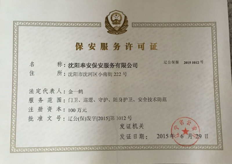 沈陽(yáng)奉安保安服務(wù)有限公司(原沈陽(yáng)市沈河區(qū)保安服務(wù)公司)創(chuàng)建于一九八八年八月,是遼寧省公安廳、沈陽(yáng)市公安局批準(zhǔn),工商行政部門(mén)登記注冊(cè),全市首家具備保安資質(zhì)的特殊性服務(wù)企業(yè),隸屬于沈陽(yáng)市沈河區(qū)政府直管的全民國(guó)有企業(yè),現(xiàn)為中國(guó)保安協(xié)會(huì)會(huì)員單位和省保協(xié)、市保協(xié)常務(wù)理事單位:在全市同行業(yè)中率先通過(guò)ISO國(guó)際質(zhì)量認(rèn)證,是市工商局批準(zhǔn)的“重合同守信用”免檢單位和沈陽(yáng)市政府采購(gòu)中心保安服務(wù)項(xiàng)目重點(diǎn)競(jìng)標(biāo)單位;擁有一支專業(yè)化、標(biāo)準(zhǔn)化、職業(yè)化的高素質(zhì)保安隊(duì)伍,是公安機(jī)關(guān)重要的輔警力量。